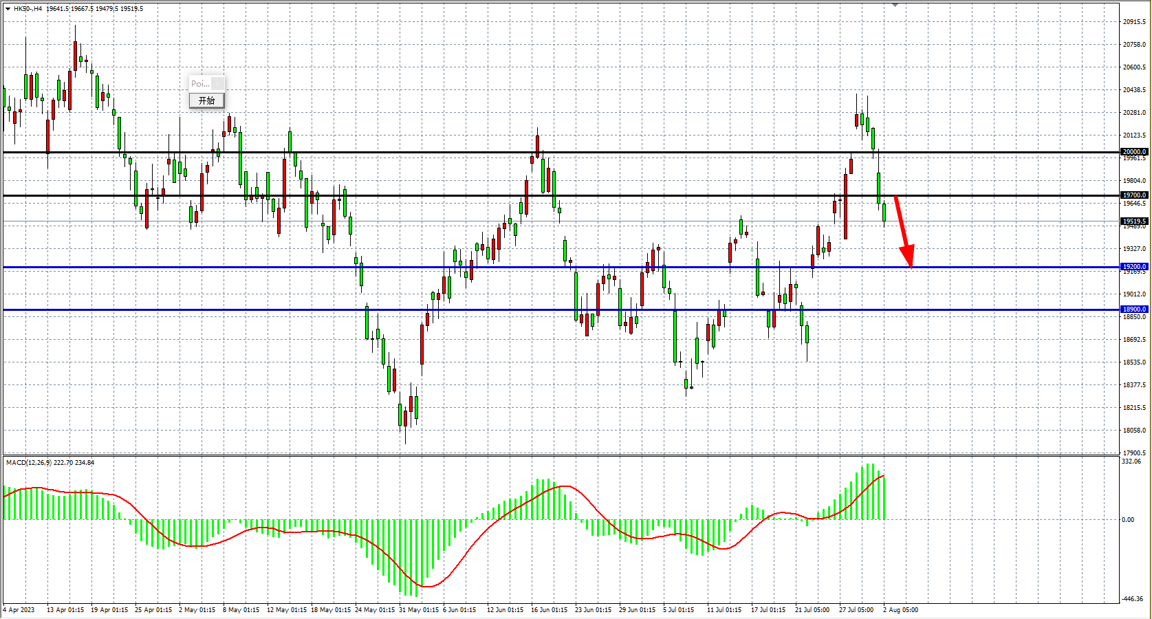 4小时图看,恒指在2000关口下继续走低跌破19700,MACD量能维持在零轴上,阻力关注19700,该位之下看19200-18900附近。