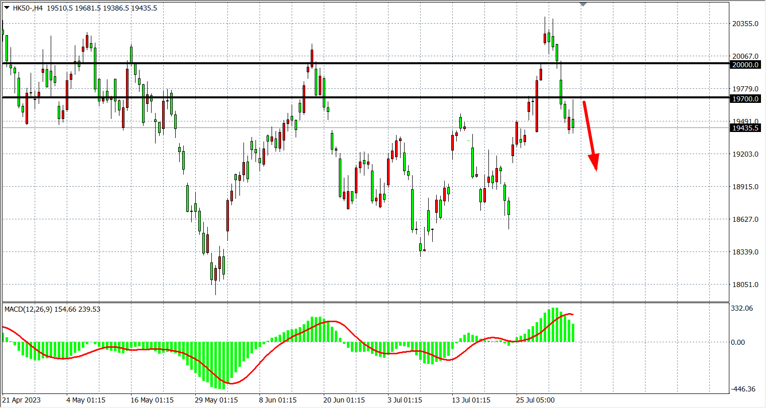 4小时图看,恒指在19700下继续走低,MACD量能在零轴上缩减,阻力关注19700,该位之下看19200-18900附近。