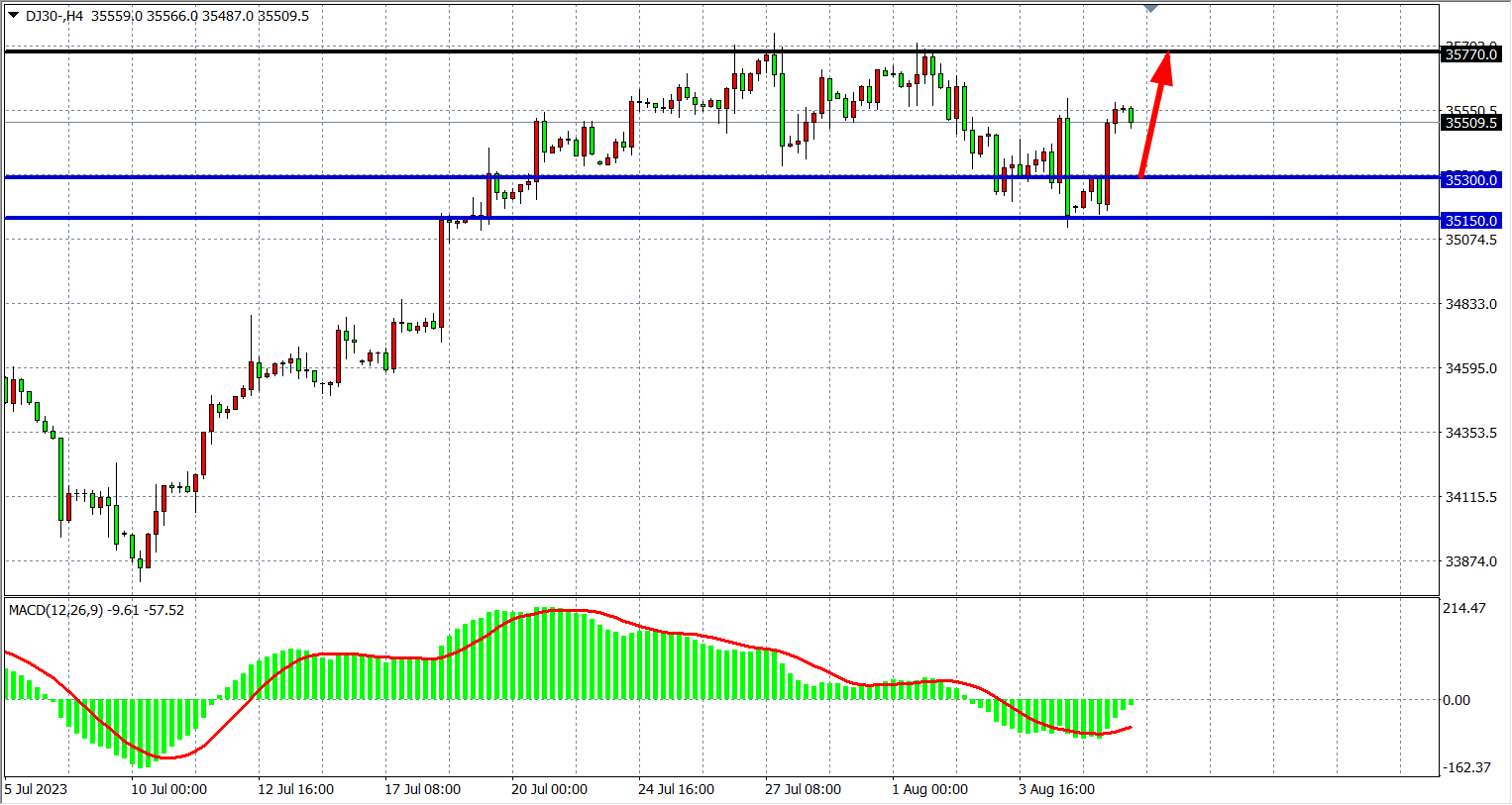 4小时图看,道指在35150附近受支撑反弹,MACD在零轴下缩量,行情继续维持高位整理,支撑关注35150-35300,阻力关注35770。