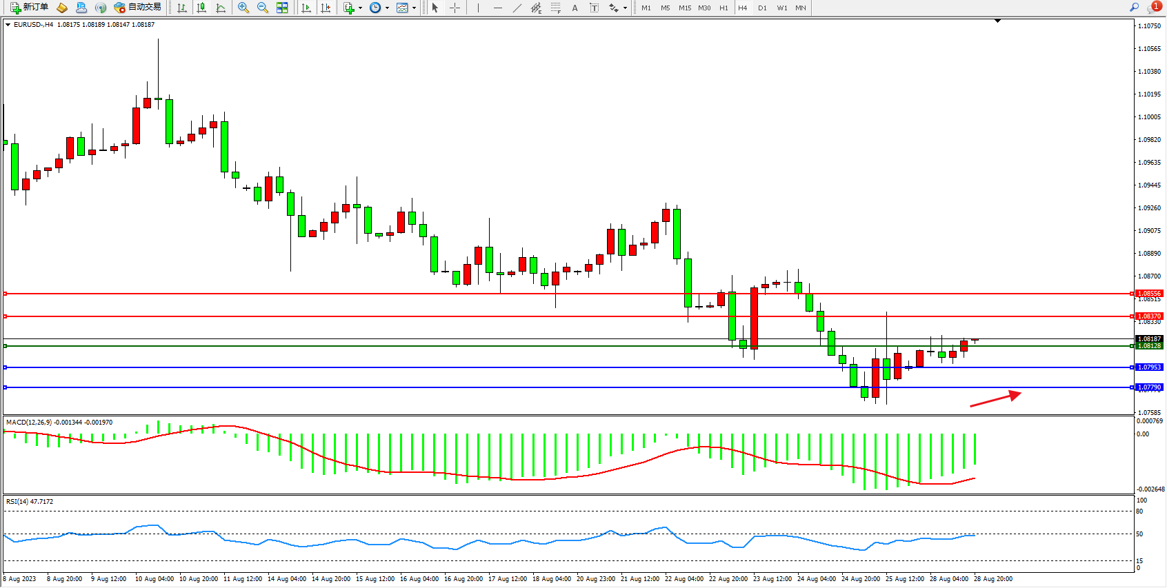 备选策略:1.08128下方看跌,目标1.07953  1.07790