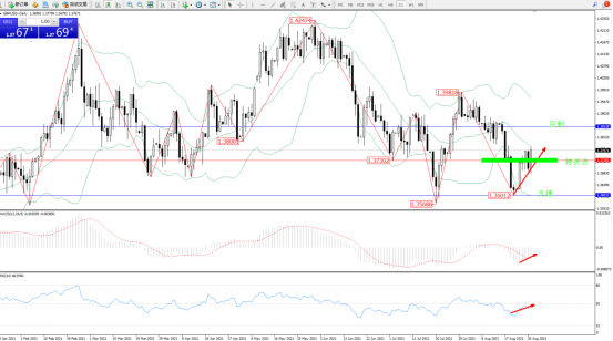 空头动力持续震荡下行至1.36012位置后急速回升,触及布林带指标中轨附近节点后有进一步向上移动迹象,布林带指标呈向下移动后开始有收口迹象,上方压制关注1.38538附近,低位支撑关注1.36012位置,关注1.37302附近转折点,MACD指标处于空头区域低位震荡缓慢上移,RSI指标处于空头区域持续震荡上移后即将触及50均衡线附近节点,如图:
