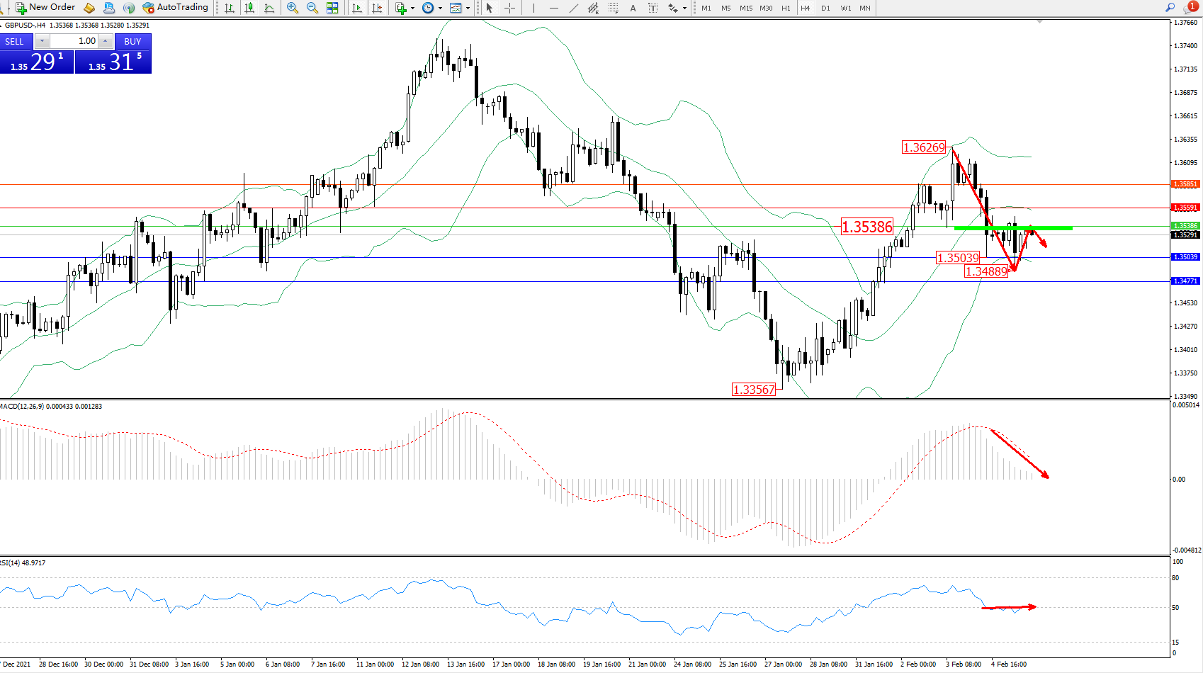 交易策略:1.35386下方看跌,目标1.35039、1.34771