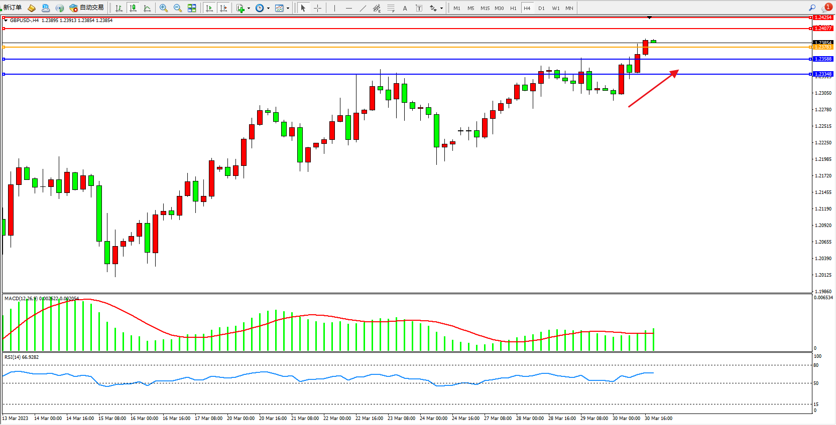 4小时图看:高位多头动力维持震荡上扬,短期看涨情绪依旧,市场多头不断向上拉升中,MACD指标处于多头区域维持整理,RSI指标处于多头区域缓慢上行;
