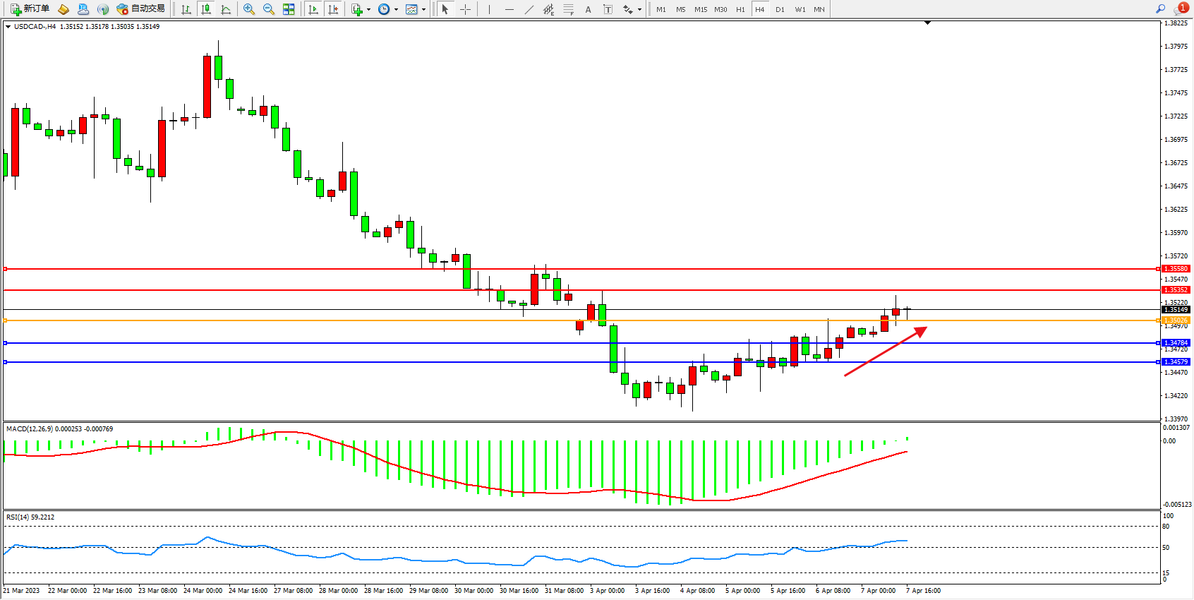 4小时图看:低位多头动力缓慢整理上移,市场看涨情绪涌现,短期多头有继续向上拉升态势,MACD指标维持震荡上移至0轴线上側徘徊,RSI指标处于50均衡线上側整理;